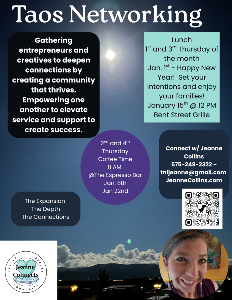- One monthly post on the Taos Networking Facebook group – highlighting your business by Jeanne Collins. You can use the group too!